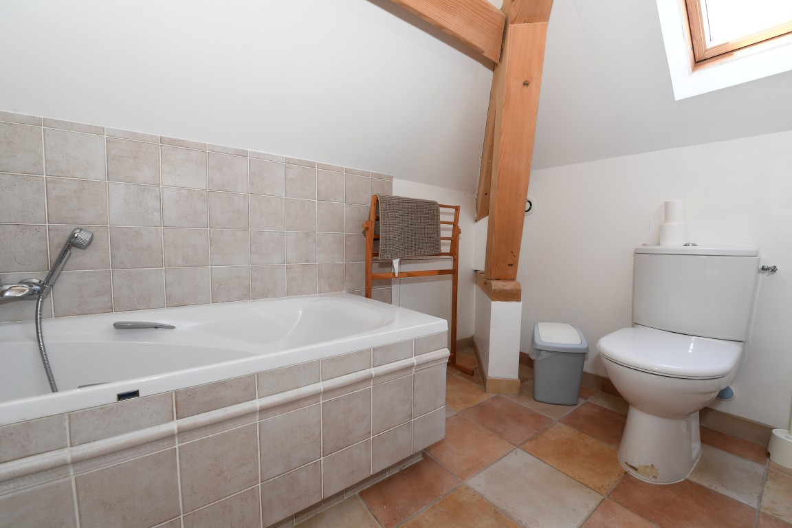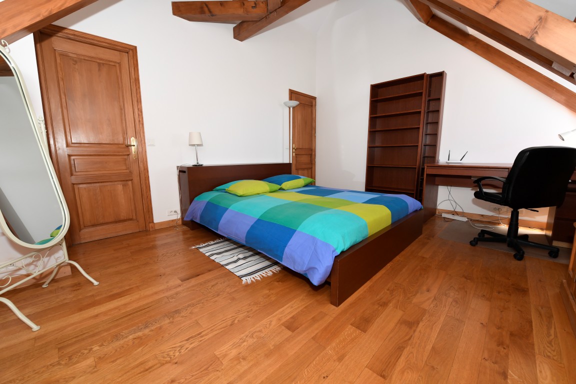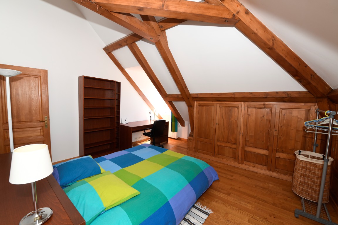 The en-suite bathroom has a washbasin, a bathtub and private toilets. A shower is available right outside the bedroom, and is shared with the occupant of the Alsace room.